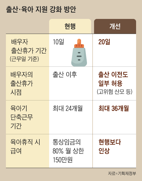 기존의 배우자 출산휴가 10일에서 20일로 확대되는 법안이 통과될 예정입니다. 이는 부모가 출산 후 더 많은 시간을 가족과 함께 보낼 수 있도록 도와줍니다.