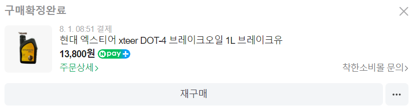 저도 얼마전 자동차 브레이크액을 교환했어요. 차량점검 시, 브레이크액 산소포화도가 높다며 교체를 권장해서 인터넷에서 제품 구매 후 공임나라에서 교환했습니다.